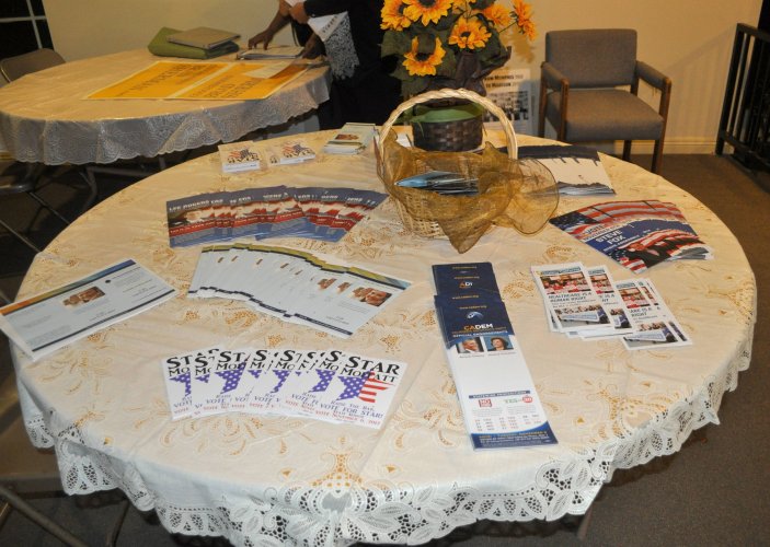Table laid out with campaign materials for several local candidates